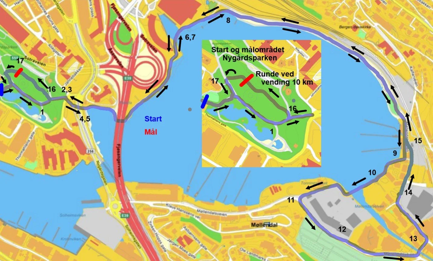 Bergensløpet starter og ender i vakre Nygårdsparken. Traseen går langs Store Lungegårdsvann til Fløen, Møllendal og tilbake til parken. Den er 5km lang (kontrollmålt og godkjent ). De som løper  10km snur i parken og tar en ny runde. Løypen er svær rask så her er det muligheter for pers.